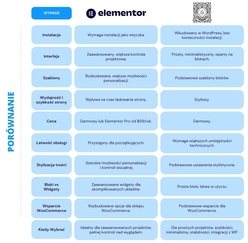 Tabela porównawcza: Gutenberg/Elementor vs Spectra